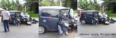 alhamdulillah.. semuanya selamat.. kereta je yg teruk.. total lost.. xdpt nk dibaiki lg...aiman dh kuar dr spital mlm td.. kaki dia kna jahit.. skg berada di rumah.. aku lak masih lom g check up lg ni.. erk..kejadian berlaku disbbkn kedua2 nya trlelap..driver adik aku, co driver adalah aku.. aku dh ngntok dan dah pn trlelap.. driver plak trlelap jg.. kete blkg kata, kete adik aku ni dh trhuyung hayang da.. lps tu kete ni dh masuk line sblh.. langgar dgn avanza. driver avanza pn ada minta maaf dgn ayah aku sbb die x dpt nk mengelak.. tp kete diorg xder la teruk sgt.. (aku rasa la).. naseb baik viva ni ada airbag yg brfungsi kedua2 nya.. huhupengajaran nye.. bila dh ngntok tu, kena la benti tepi jalan.. atau co driver kna la memainkan peranan... erk.. pesanan utk diri sndiri ini jgk..